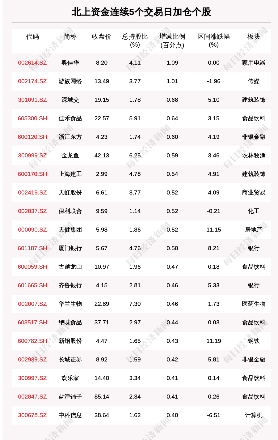 每經(jīng)AI快訊,8月1日,北上資金連續(xù)5個(gè)交易日買(mǎi)入183只個(gè)股。北上資金連續(xù)5個(gè)交易日加倉(cāng)個(gè)股中,奧佳華(002614.SZ,收盤(pán)價(jià):8.20元)增持比例增幅最大,5個(gè)交易日增持1.09個(gè)百分點(diǎn),其他增持比例較大的個(gè)股包括游族網(wǎng)絡(luò)(002174.SZ,收盤(pán)價(jià):13.49元)、深城交(301091.SZ,收盤(pán)價(jià):19.15元)、佳禾食品(605300.SH,收盤(pán)價(jià):22.57元),分別增持1.01個(gè)百分點(diǎn)、0.68個(gè)百分點(diǎn)、0.64個(gè)百分點(diǎn)。