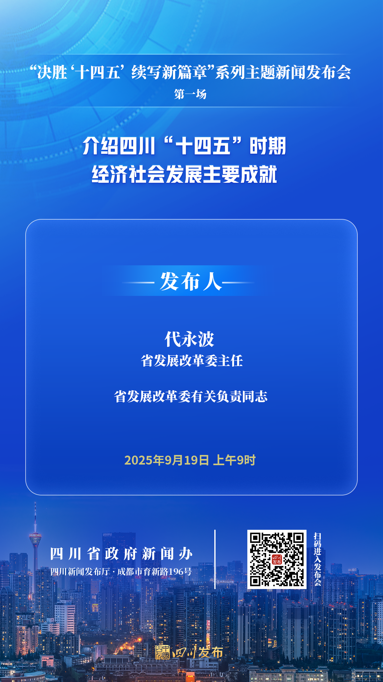 2025年9月19日(星期五)9:00,省政府新聞辦將在四川新聞發布廳舉行“決勝‘十四五’ 續寫新篇章”系列主題新聞發布會第一場,省發展改革委主任代永波圍繞四川“十四五”時期經濟社會發展主要成就作介紹并答記者問,省發展改革委有關負責同志參加答記者問。四川發布客戶端將全程圖文直播,敬請關注!