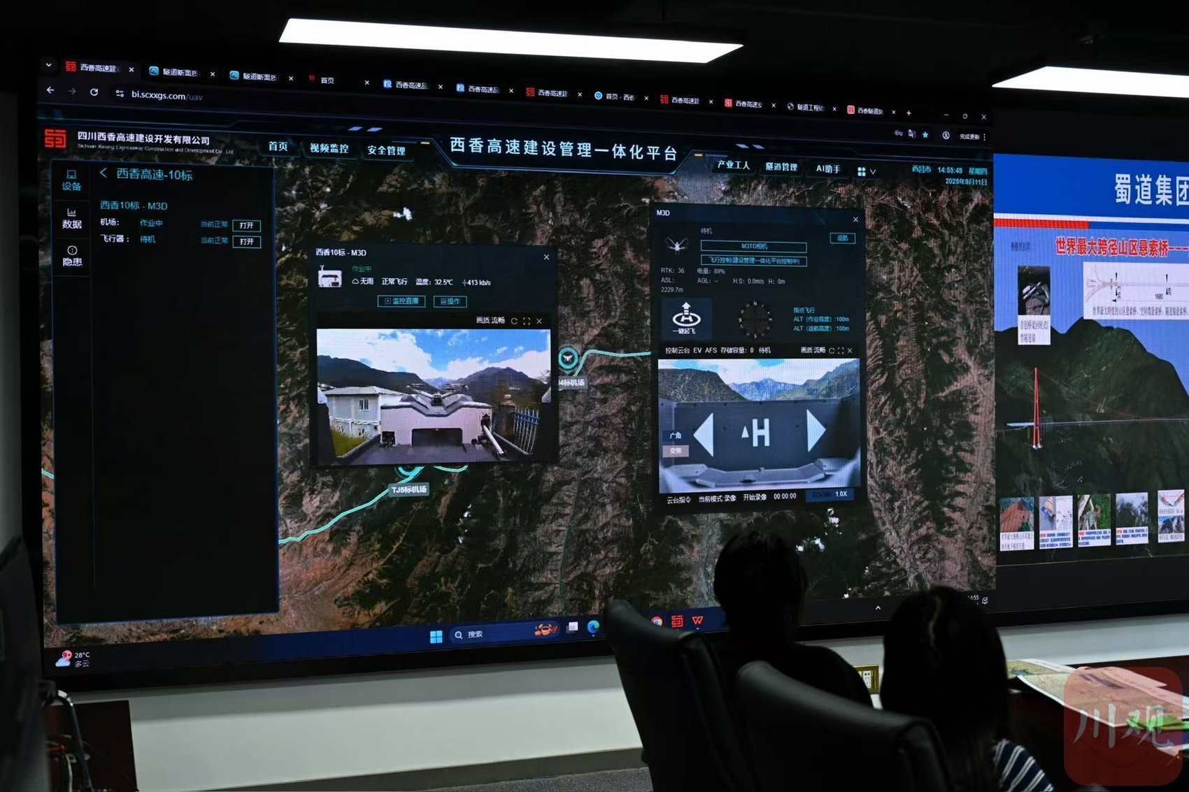 “一切施工盡在掌握。”來到西香高速的調度指揮中心,大屏幕上施工進度一目了然,一鍵操控無人機,管理人員仿佛裝上“千里眼”,AI助手、試驗室等多個模塊輔助,可實時同步項目建設各環節試驗數據,可輔助對不合格情況的倒查追溯管控,這是一條創新路,更是一條“智慧路”。