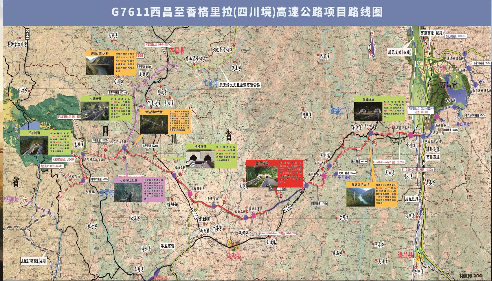 西香高速的九大超級工程包括三橋五隧一互通,“三橋”中除了瀘沽湖特大橋、理塘河特大橋外,雅礱江特大橋的組合橋面板也是懸索橋的首次應用。“五隧”包括西昌隧道、鹽源隧道、棉椏隧道、木里隧道、長柏隧道,均為10公里級超特長隧道。