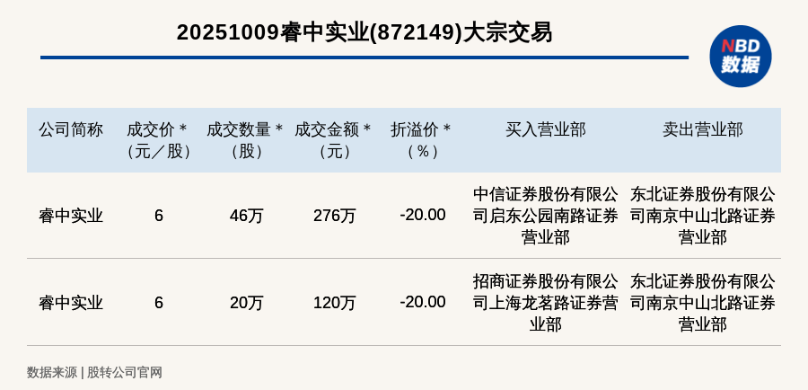 每經訊,2025年10月9日,新三板創新層公司睿中實業(872149,收盤價:7.5元)發生2筆大宗交易,總成交金額為396萬元,成交金額最高的一筆成交價6元/股,成交數量46萬股,成交金額276萬元,折價20%。買入營業部是中信證券股份有限公司啟東公園南路證券營業部,賣出營業部是東北證券股份有限公司南京中山北路證券營業部。