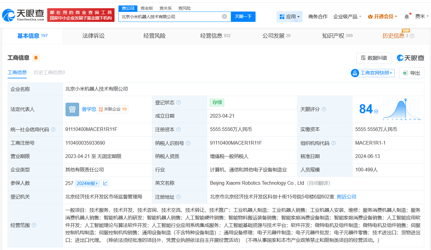 每經AI快訊,天眼查App顯示,近日,北京小米機器人技術有限公司登記“第三代人形機器人CyberOne”作品著作權,作品類別為美術。該公司成立于2023年4月,法定代表人為曾學忠,注冊資本約5556萬人民幣,經營范圍包括工業機器人制造、工業機器人銷售、服務消費機器人制造等,由北京小米智能科技有限公司、北京屹唐創欣創業投資中心(有限合伙)共同持股。