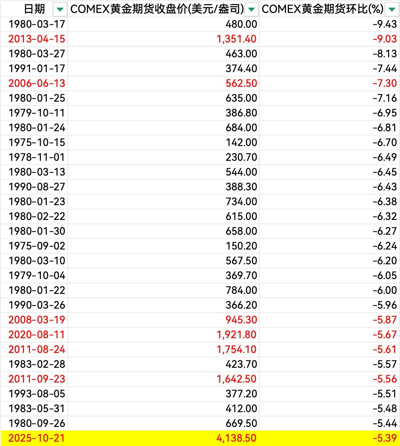 黃金大跌的走勢大約始于北京時間10月21日下午3點,COMEX黃金價格一路從4350美元/盎司的水平大幅下跌至4130美元/盎司附近,最終以橫盤震蕩結束全天的交易,當日跌幅達5.39%,創下今年以來的最大單日跌幅。