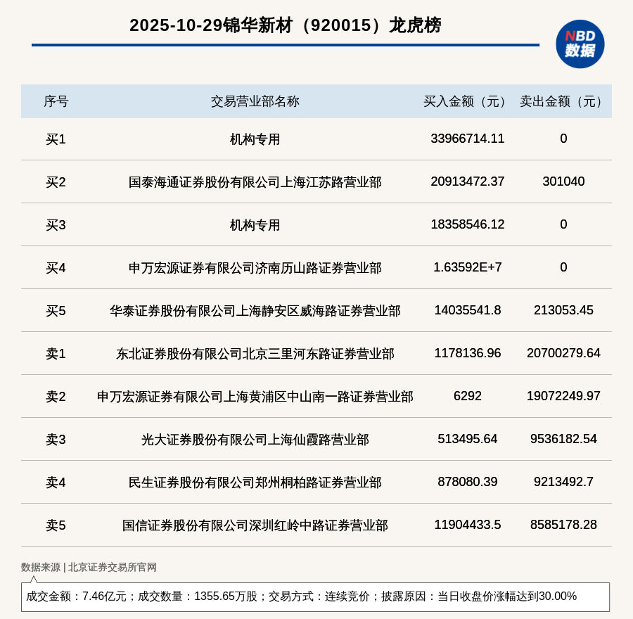 每經訊,2025年10月29日,北交所上市公司錦華新材(920015,收盤價:62.92元)登上龍虎榜,交易方式是連續競價,披露原因是當日收盤價漲幅達到30.00%,成交數量1355.65萬股,成交金額7.46億元。買一席位為機構專用,買入3396.67萬元;賣一席位為東北證券股份有限公司北京三里河東路證券營業部,賣出2070.03萬元。