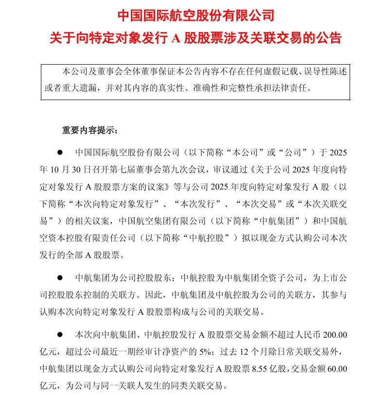 10月30日中國國航公告,擬向控股股東中航集團等發行A股,募資不超200億元,價格6.57元/股,用于還債及補流,中航集團等將現金認購全部股票,發行后其仍為控股股東。同日,國航發布2025年三季報,前三季度營收1298.26億元,同比增1.31%,凈利潤18.70億元,同比增37.31%;第三季度營收490.69億元。
