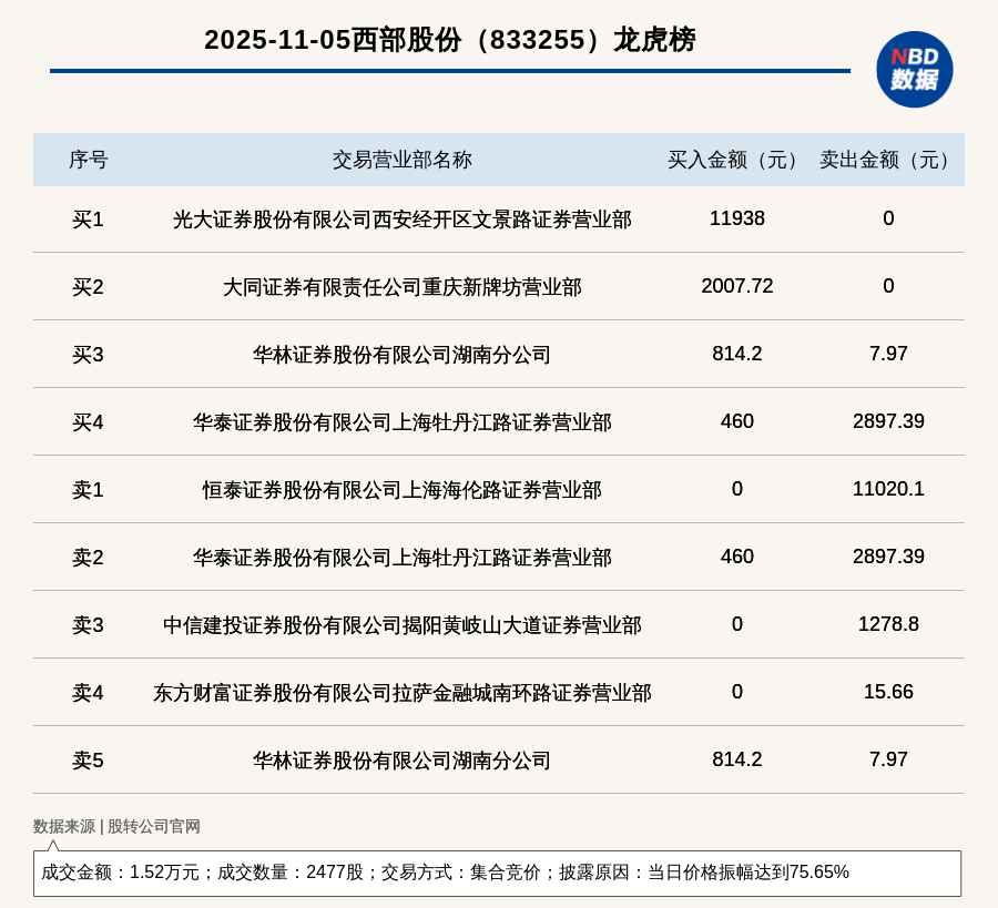 每經訊,2025年11月5日,新三板創新層公司西部股份(833255,收盤價:6.6元)登上龍虎榜,交易方式是集合競價,披露原因是當日價格振幅達到75.65%,成交數量2477股,成交金額1.52萬元。買一席位為光大證券股份有限公司西安經開區文景路證券營業部,買入1.19萬元;賣一席位為恒泰證券股份有限公司上海海倫路證券營業部,賣出1.1萬元。