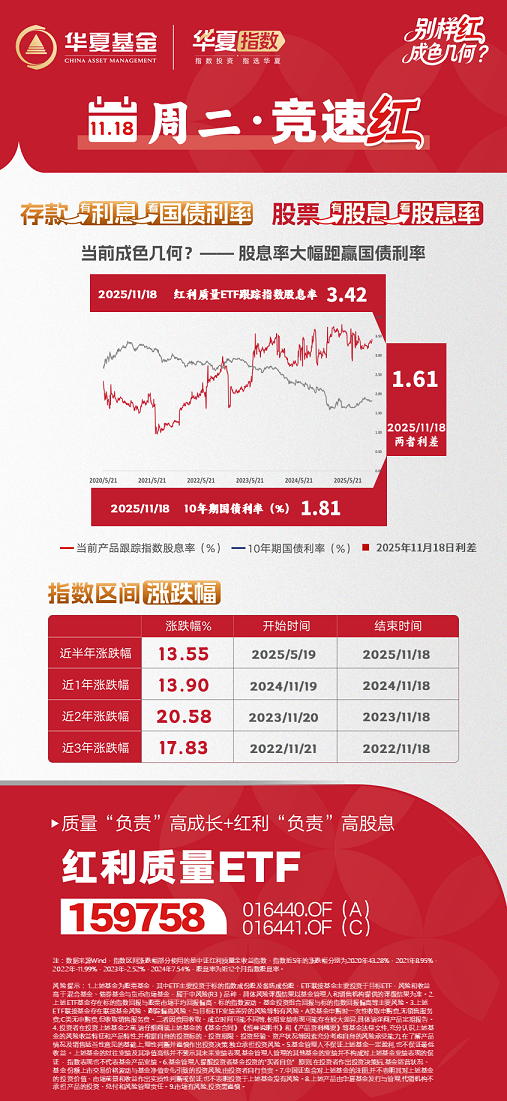 那么,當(dāng)前紅利質(zhì)量ETF(159758)跟蹤指數(shù)的股息率到哪里了呢?截至2025年11月18日,指數(shù)近12個(gè)月股息率是3.42%,高于同日10年期國債收益率有1.61%。
