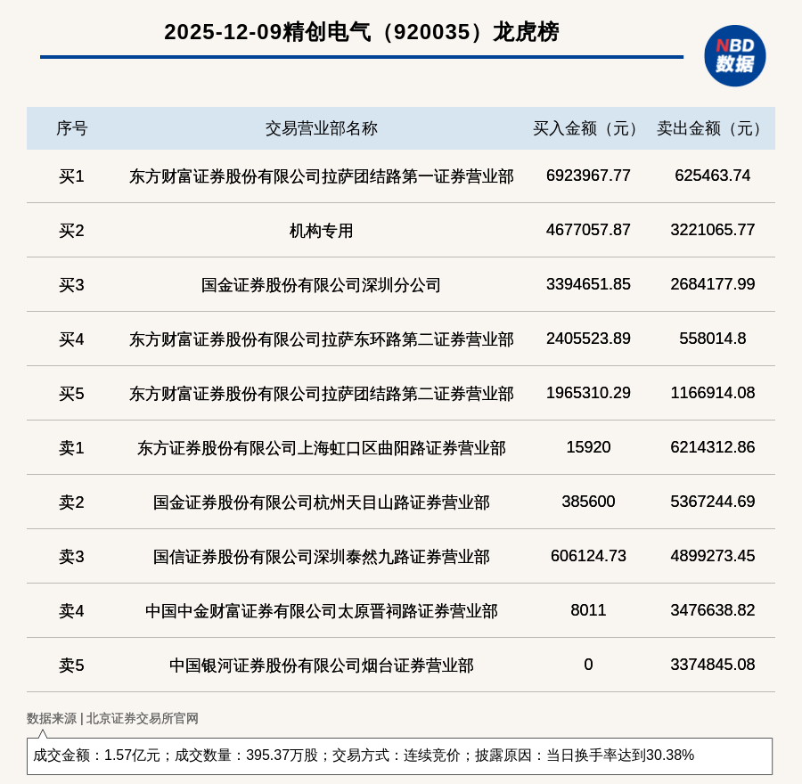 每經訊,2025年12月9日,北交所上市公司精創(chuàng)電氣(920035,收盤價:39.8元)登上龍虎榜,交易方式是連續(xù)競價,披露原因是當日換手率達到30.38%,成交數量395.37萬股,成交金額1.57億元。買一席位為東方財富證券股份有限公司拉薩團結路第一證券營業(yè)部,買入692.4萬元;賣一席位為東方證券股份有限公司上海虹口區(qū)曲陽路證券營業(yè)部,賣出621.43萬元。
