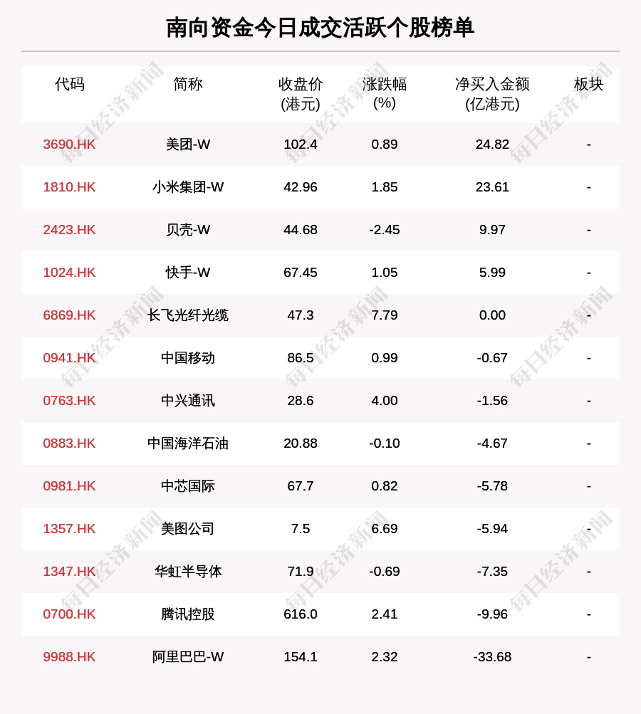 南向資金成交活躍個股榜單中,凈買入個股共4只,金額最多的是美團-W(3690.HK,收盤價:102.4港元),凈買入24.816億港元;凈賣出個股共9只,金額最多的是阿里巴巴-W(9988.HK,收盤價:154.1港元),凈賣出33.681億港元。