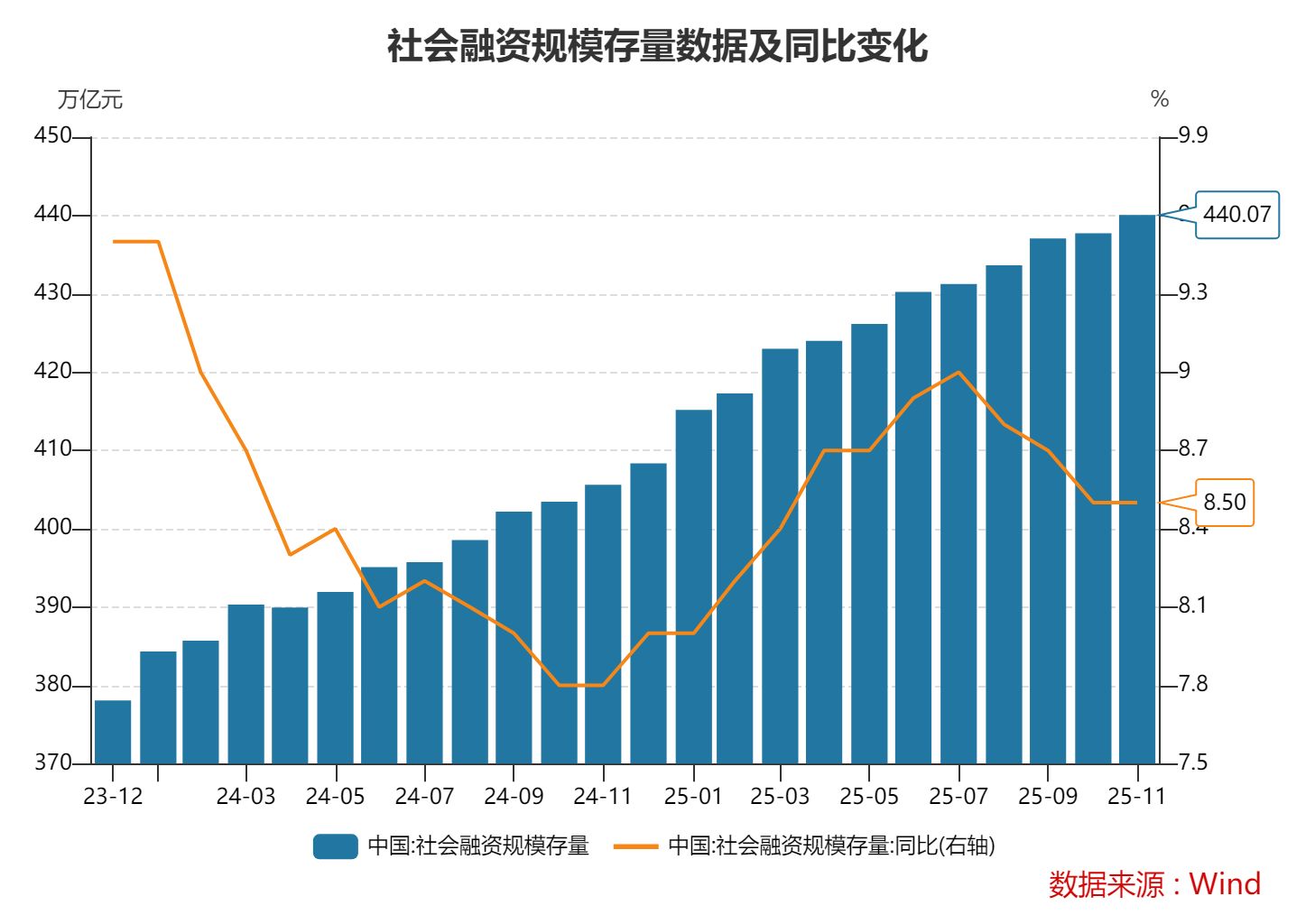 12月12日,人民銀行披露最新金融統計數據。初步統計,2025年11月末社會融資規模存量為440.07萬億元,同比增長8.5%。