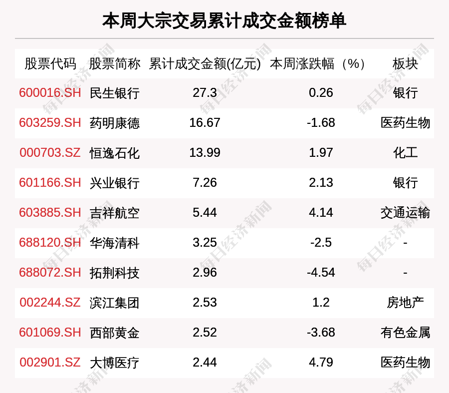 本周大宗交易累計成交金額前3的公司是民生銀行、藥明康德、恒逸石化,累計成交金額分別為27.3億元,16.67億元,13.99億元。