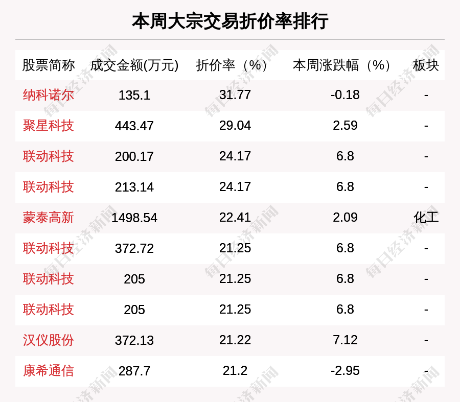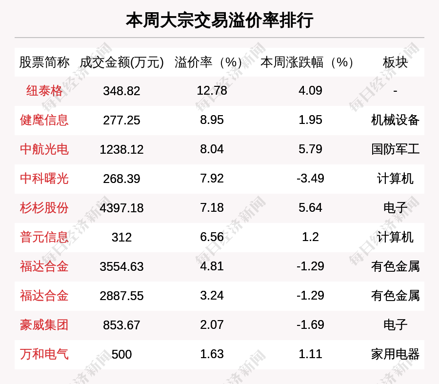 溢價交易方面,本周有1筆大宗交易溢價率超過10%。