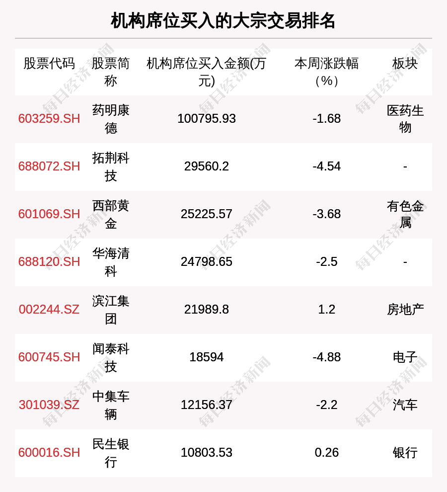 本周機構專用席位參與了350筆大宗交易,環比上周減少188筆。本周機構席位買入金額前3的公司為藥明康德、拓荊科技、西部黃金,機構買入金額分別為10.08億元、2.96億元、2.52億元。